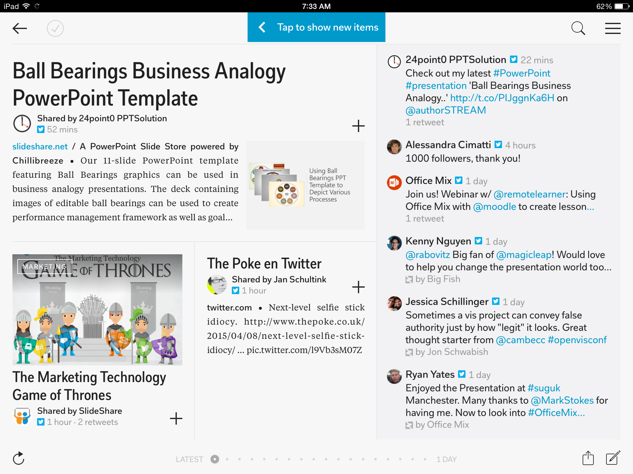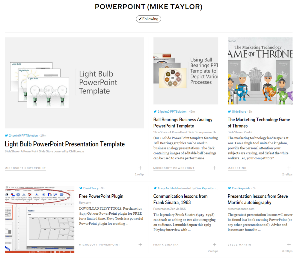 Add your Twitter list to Flipboard, and it will pull out all the great content and links that get shared through the list. Here is what my PowerPoint list from Twitter looks like: