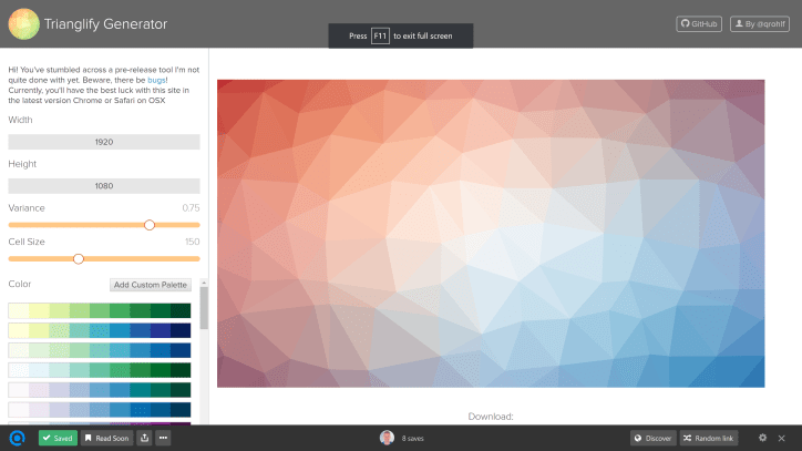 Trianglify is a really slick, easy to use online tool for generating your own custom “trianglified” background images. Use their colors or your own, either way you’ll get a great looking result.