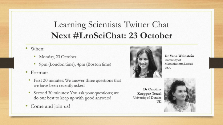 Mark your calendar for the next #LrnSciChat that is going down on Monday, 23 Oct @ 4pm (Easter time / 9pm London time). Head on over to Twitter and follow them now! Dr Yana Weinstein – @doctorwhy, Carolina Kuepper-Tetzel @pimpmymemory and the Learning Scientists account at @acethattest. Also, don’t forget to subscribe to the Learning Scientist blog!