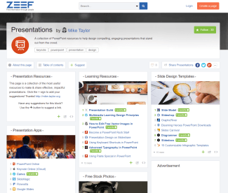 This is the easiest bar to clear and Zeef does this really well. When you create a page you’ll get a URL that looks something like yourtopic.zeef.com. The thing I like best about how Zeef presents the links is the ability to organize likes into subtopics. (Zeef calls them blocks.) You can also add descriptions and image headers for each block. Compare the display of this Zeef page to a similar collection of Diigo bookmarks.