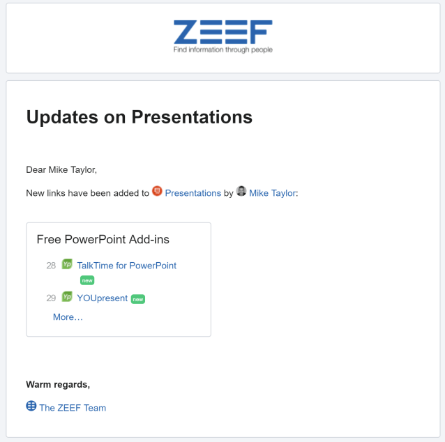 All Zeef pages have a Follow button that will let you get an email notification anytime new items are added to the page. No need to make any wasted visits looking for new stuff! Here’s what a notification looks like in your inbox.