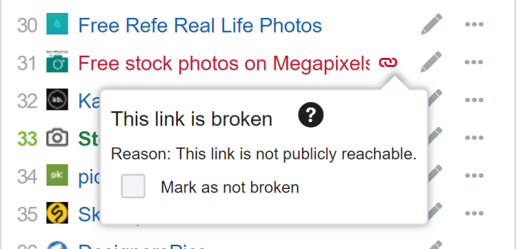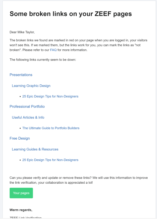 One of the challenges with curated collections is that over time some of your resources vanish from the web leaving you with dead links. Zeef keeps an eye on your links and notifies you if any of them go bad.On your page look for any links that have turned red.