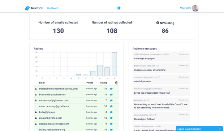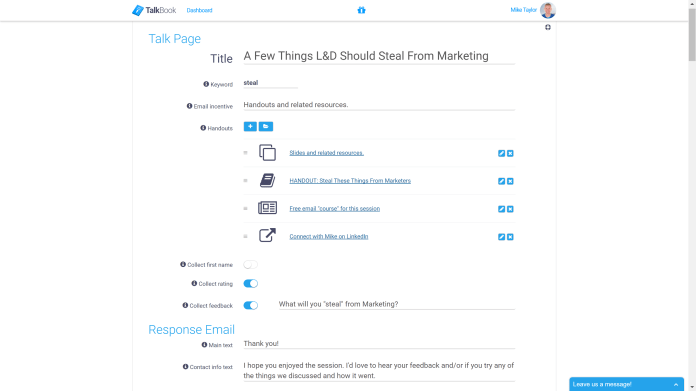 Fortunately, there’s a simple solution to handle those important post-event tasks with ease while saving you a lot of time in the process. Talkbook is a website that will collect ratings and feedback from your audience and also automate the distribution of any follow-up information and supporting materials you want to provide.