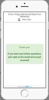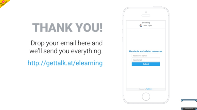 Instead of collecting business cards, then spending hours entering them as contacts (If you haven’t lost them before you get home!) and manually emailing your handouts, Talkbook automates this process so you’re audience gets everything you want them to have immediately after you wrap-up.