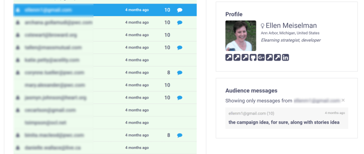 Nice huh? So is the information you’ll get about the people from your audience. If they’ve used the same email to get your handouts as they use for their social media accounts Talkbook will connect you to them on LinkedIn, Twitter, etc.