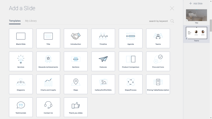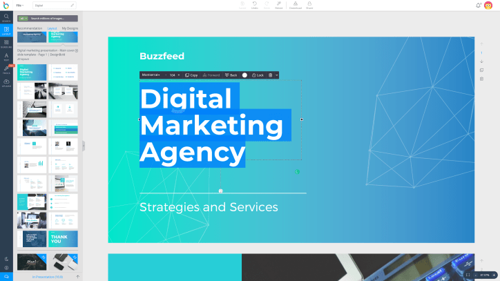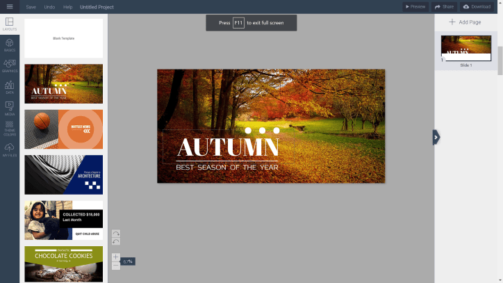 If you are creating a lot of infographics and presentations, you will definitely want to look at Visme. For those types of projects, you’ll find a flexible workflow with a variety of charts and graphs, as well as a built-in library of pre-designed layouts which you can mix and match in any order to build slide decks and infographics.