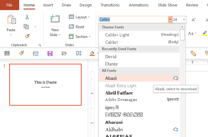 You can see above that I have a cloud icon next to some of the fonts showing in PowerPoint. (This is in the other Office apps too.) Those are the new cloud fonts and all you have to do to use them is select them from the list. Microsoft handles the rest and you can sleep soundly knowing that anyone else who presents or works with your Office documents will have access to it. No more wonky slides and documents for the people on the receiving end who don’t have that custom font you used.