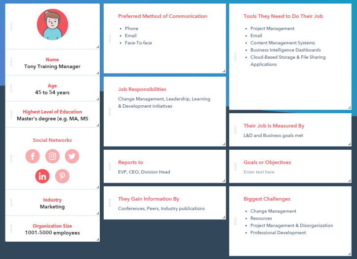 If you’re not already familiar with personas, a marketing persona is a composite sketch of a key segment of your audience. For both L&D and marketing purposes, personas can help you deliver content that will be most relevant and useful to your audience. Personas add a few key items that are missing from a typical learner needs analysis. One important thing is the fact that personas are defined by their goals. Creating effective, engaging learning requires more than just a collection of demographics which is why I like how personas help us take into consideration the needs, experiences, behaviors and goals of our audiences. As Bianca says, what they see, what they feel, what they experience.