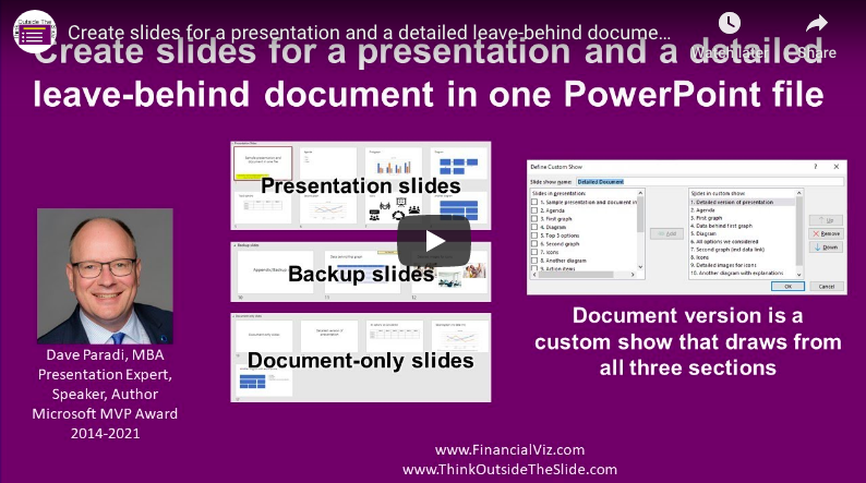 Dave Paradi has a creative solution for creating a single PowerPoint file that is designed to serve both as your presentation slides and the handouts for your audience. Normally, you’d need to create and manage two separate files for this but Dave shows you how to use PowerPoint’s “Custom Show” feature to manage them within a single PowerPoint file.
