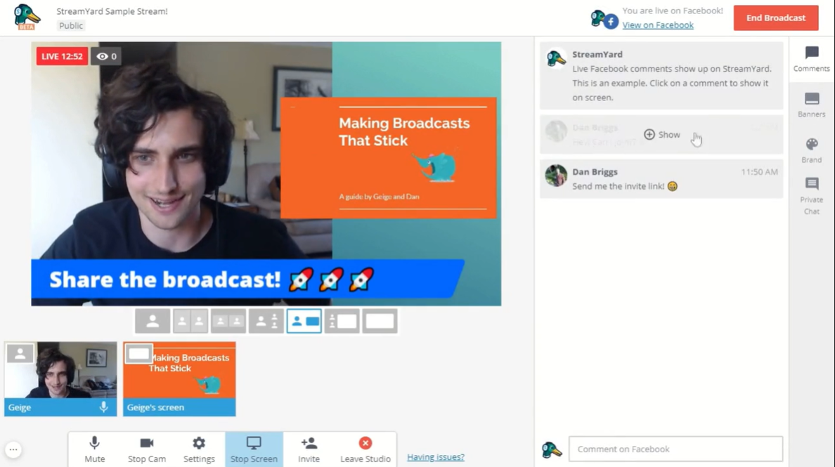 Streamyard is an easy way to create professional live streams. This is a live streaming studio in your browser. Interview guests, share your screen, and much more. Stream directly to Facebook, YouTube, LinkedIn, and other platforms.