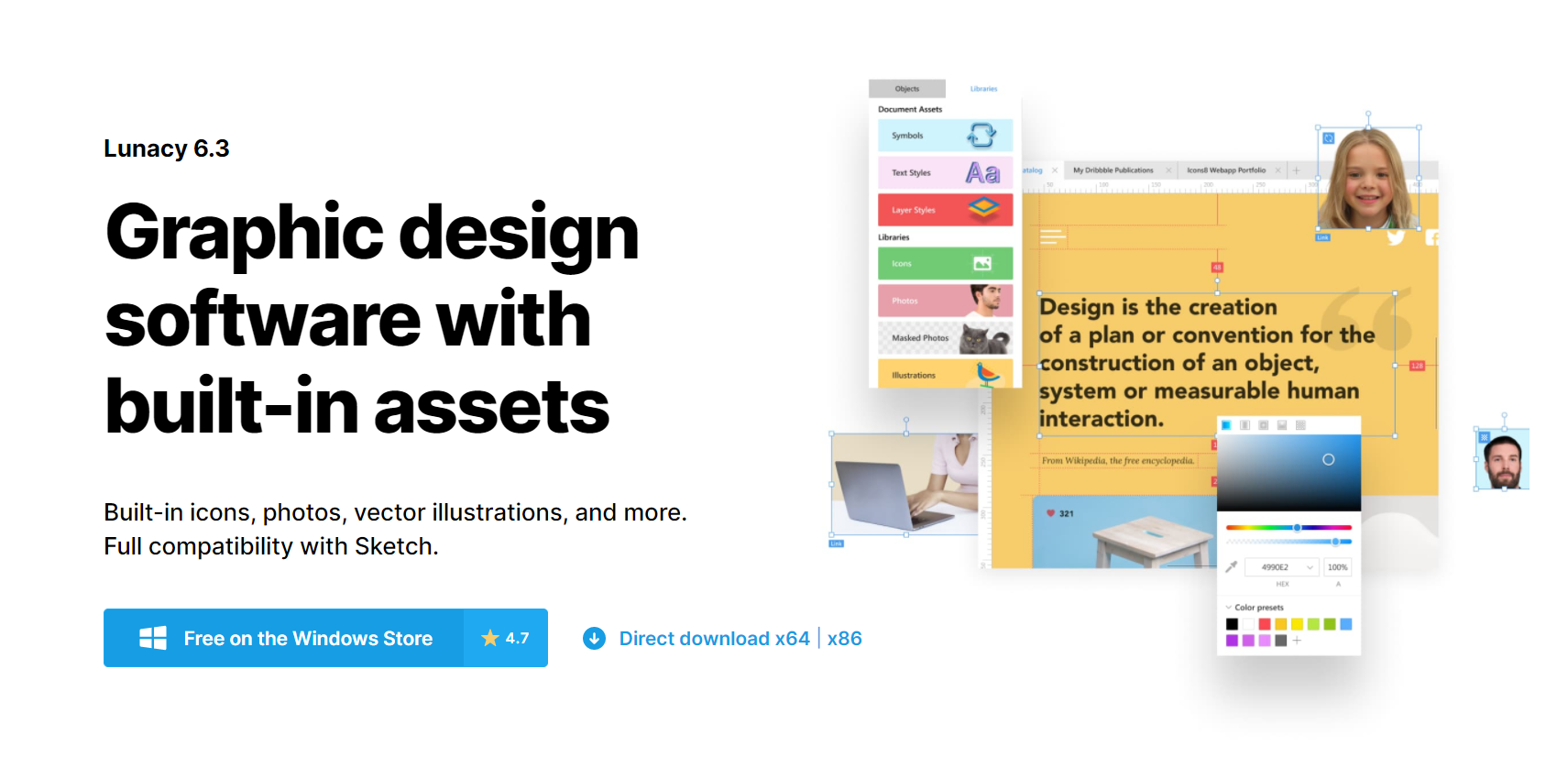 Lunacy is a powerful vector design tool for Windows. Sketch is a standard file type for design projects, but it is focused on the Mac environment. Lunacy unlocks the Sketch world for those of us working in Window, including reading and saving (!) Sketch files. It’s free of charge without any time limit. Plus, it comes with a nice library of assets.