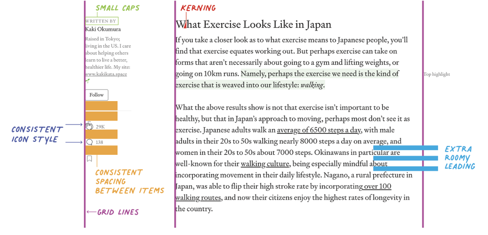 This article from the Nielsen Norman Group tells us that visually aesthetic designs use consistent typography, establish a clear hierarchy, utilize a refined color palette, and align to a grid.