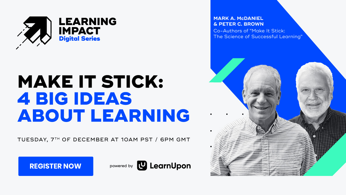 In this recorded webinar, Peter C. Brown and Mark A. McDaniel, co-authors of “Make It Stick: The Science of Successful Learning”, share techniques based on 10 years of cognitive psychology research for becoming more productive learners. Learn why retrieval, not review, makes learning stick, how spaced learning and mixed practice can increase learner retention, and see some studies on how these methods have been implemented in business environments.