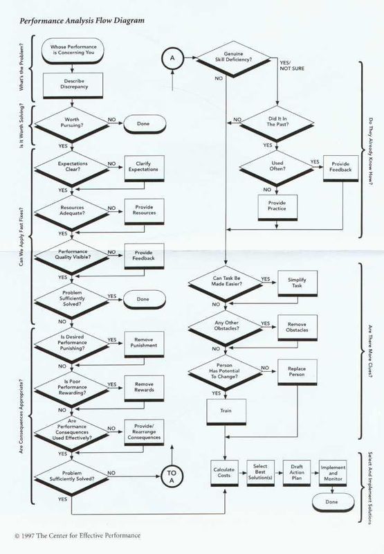 This flow chart comes from Mager & Pipe’s book “Analyzing Performance Problems: Or, You Really Oughta Wanna–How to Figure out Why People Aren’t Doing What They Should Be, and What to do About It“. One of the most important things this flow chart does is to emphasize the importance of identifying non-training solutions before considering training as a solution.