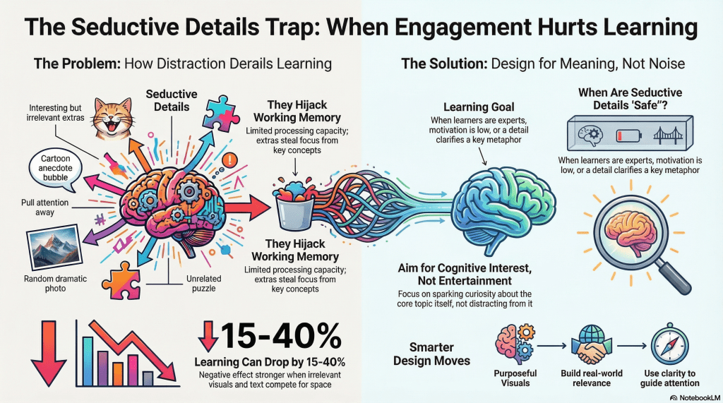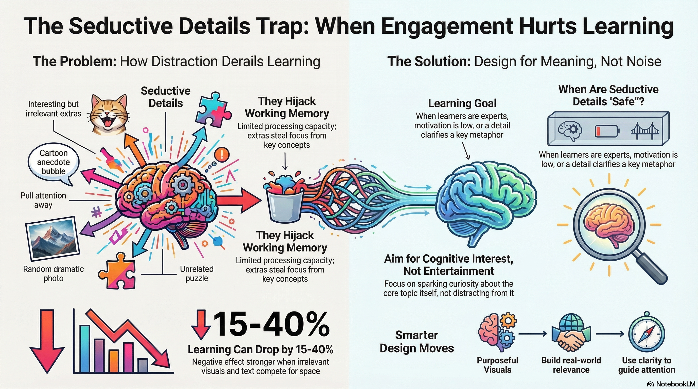 And just like that, you’ve stepped into one of the most reliable traps in instructional design: the seductive details effect—where interesting but irrelevant extras quietly pull attention away from the actual thing you need people to learn.