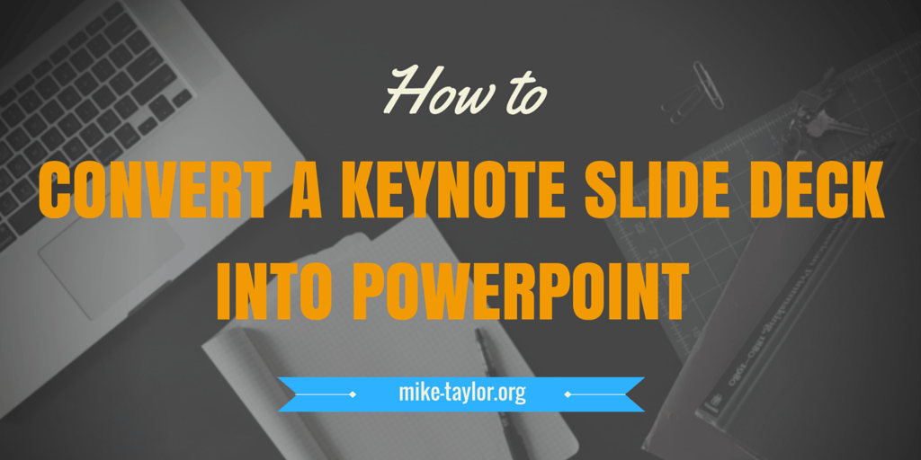 Every once in awhile I find a great looking Keynote slide deck, like these over at Site2Max, and I think how great it would be to bring it over into PowerPoint to customize it. Fortunately, there is a super simple and free way to do just that – even if you don’t have access to theContinueContinue reading “Converting Keynote to PowerPoint”